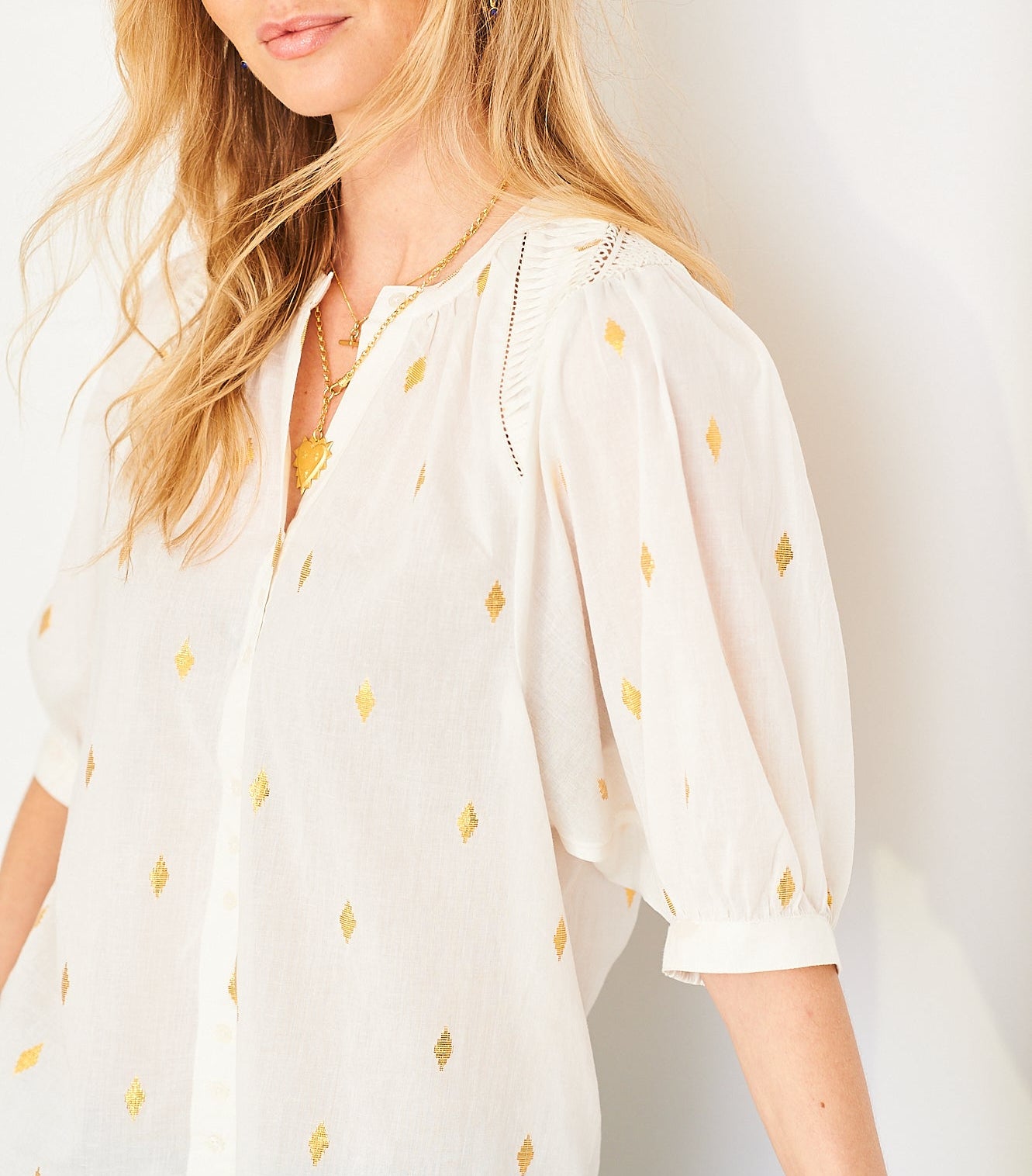 A truly exquisite blouse, Carmen will help you stand out from the crowd in an understated, effortlessly stylish way. With gold foil embroidery and lace inserts, this stunning blouse exudes feminine spring chic.